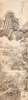 hanging scroll, ink and colour on paper, depicting a village and mountain landscape with a single scholar visible in his home