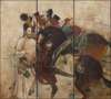oil on canvas, three panel screen, signed and dated 1995; the reverse painted with two archers and horses, by the same hand, signed and dated 1995