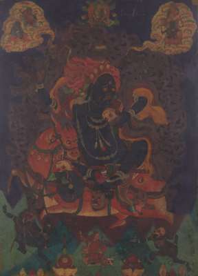 hanging scroll, painted with a deity and attendants, 68cm high, 48cm wide; together with TWO FURTHER THANKAS (3)
