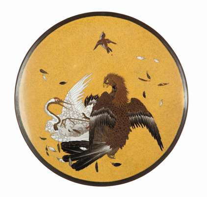 of shallow circular form, depicting an eagle and crane on a yellow enamel ground