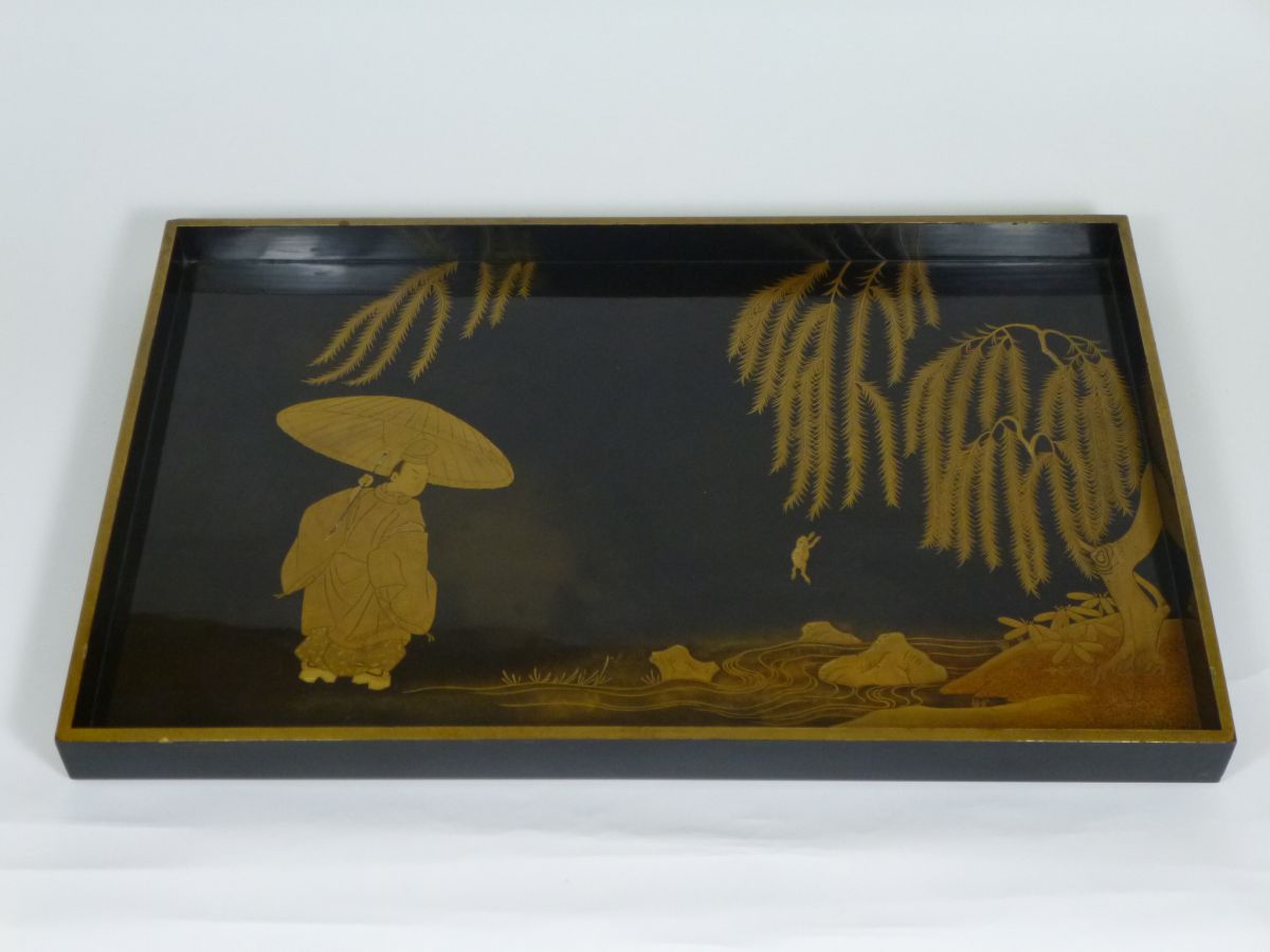 the rectangular tray decorated with a figure standing beside a stream with a leaping toad and willow trees