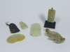 comprising: a pale celadon jade bamboo stem among lingzhi fungus; a celadon jade belt buckle shaped as a ruyi head; a grey-green jade bowl in the form of a bat; a small celadon jade pendant with inscription and metal stand; and two archaic-style carvings (6)