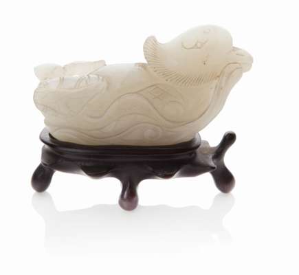 the first carved from pale celadon stone in the form of a duck among lotus, with carved wood stand, the second from darker stone in the form of two monkeys (2)