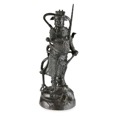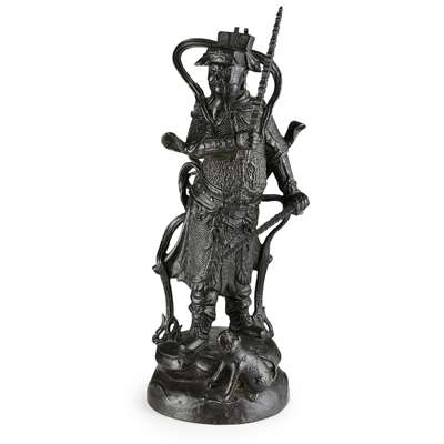 the pagoda-bearing Heavenly King shown standing on a circular plinth, wearing an elaborate suit of armour with a celestial scarf billowing above his shoulders and trailing down the sides