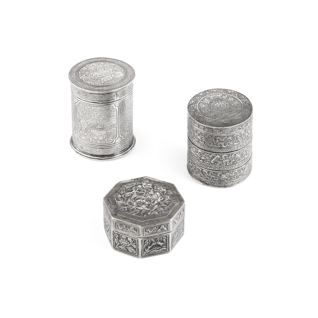the first a cylindrical three-tiered box, the sides embossed with three bands of beribbons precious antiques, the second a cylindrical box, chased with panels enclosing precious antiques and animals amongst plants, the third an octagonal box, repoussé-worked with birds and flowers, the base marked '? Fu Ji (first character illegible), primary silver' (3)