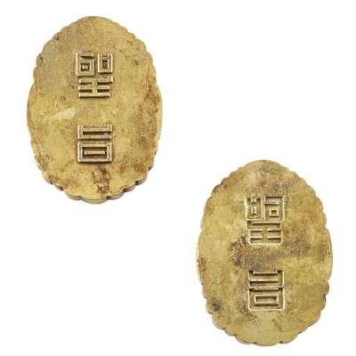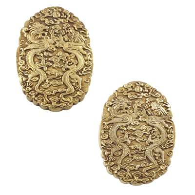 composed of two matching parts, both cast on the outside with a pair of dragons confronting each other amongst ruyi cloud scrolls, the interior with the positive and negative cast of the two characters 'sheng zhi' (imperial edict)