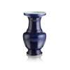 the globular body raised on a spreading pedestal foot, rising to a widely flared trumpet-shaped neck encircled by two bow-string bands, the exterior covered in a dark blue glaze