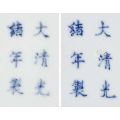each painted to the interior with a pair of five-clawed dragons chasing a flaming pearl amidst flames and cloud scrolls, surrounding a central medallion with a shou character and five bats (2)