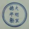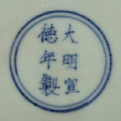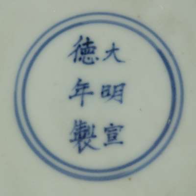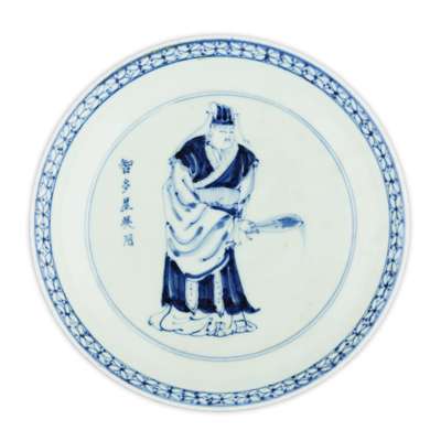 one decorated with the 'Faceless' Jiao Ting, the other with the 'Resourceful Star' Wu Yong within a medallion to the interior, the exterior glazed blue, six-character Xuande mark to the base (2)