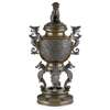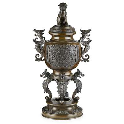the globular vase-form censer supported on four feet in the shape of winged dragons above a two-tier cylindrical pedestal, the body of the vase decorated with two large shaped panels enclosing an elaborate design of winged dragons flanking auspicious objects, the shoulder applied with two dragon handles, the cover surmounted by a full-size shishi lion finial