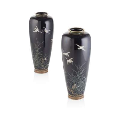 PAIR OF MIDNIGHT-BLUE GROUND CLOISONNÉ ENAMEL VASES