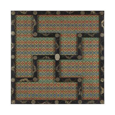 of square shape, the cover painted in black and gold lacquer with a front facing five-clawed dragon coiled around a flaming ball, amongst lingzhi clouds, surrounded by four large flowerheads issuing scrolling tendrils, the interior with a brocade covered board with wanzi-shaped cross braces