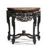 the marble-inset top above an elaborately carved and pierced 'dragon and carp' frieze, the four legs decorated in low relief with blossoming branches and terminating in animal mask feet joined by an x-stretcher
