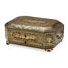 of rectangular form with chamfered corners, the top and sides decorated in gilt with cartouches depicting Chinese scholars and their family on garden terraces, the interior fitted with a tray divided into compartments, the box supported on four carved animal feet