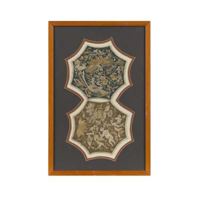 embroidered on a beige ground with figures within a garden, a mandarin and an attendant with a lantern below a willow tree, a lady and her female attendant next to a pavilion, framed and glazed, 49x8.4cm (sight); together with TWO EMBROIDERED SILK PLACEMATS, 15.5cm wide (2)