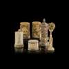 one carved and pierced to the body with two scholars appreciating a scroll and another scholar being served tea by a boy, the other with a boy on a buffalo and a farmer and son on the way to work, with wood stand, 11.5cm high; together with an IVORY PUZZEL BALL AND STAND, 18cm high; a SILVER-MOUNTED CARVED IVORY OVAL BOX AND COVER, 7cm wide; a JAPANESE CARVED IVORY BRUSHPOT AND COVER, 12cm high; and a JAPANESE IVORY SHRINE, 19cm high (6)