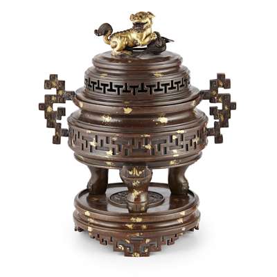 ARCHAISTIC GOLD-SPLASHED BRONZE TRIPOD CENSER AND STAND