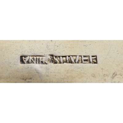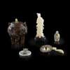 formed of a celadon jade bangle, filled with a silver panel finely repoussé worked with a mouse amongst grapevines, the silver stand embellished with coloured hardstones, 7.5cm diam; together with a SILVER STRAINER WITH JADE HANDLE, 15.5cm long; an INSIDE PAINTED GLASS SNUFF BOTTLE, painted with Huang Tingjian and a boy, 7.5cm high; a ROOTWOOD TRIPOD CENSER AND COVER, 18cm high; a CARVED AGATE FIGURE OF HE XIANGU, 18cm high (5)