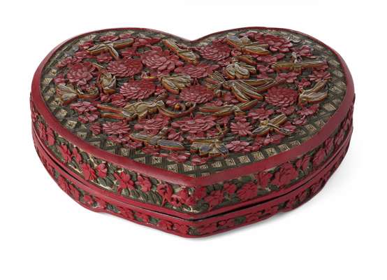 the cover carved in relief with different species of insects, including dragonfly and mantis, amid large chrysanthemum and peony flowerheads upon a deeper layer of leaves, the sides carved with further flowers and leaves, both the interior and the bottom black-lacquered