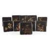 each of square form with rounded corners, raised on four short bracket feet, lacquered in gold, silver and red takamaki-e on the roiro ground with various birds including swallows, cockerels and magpies, with wood box (10)