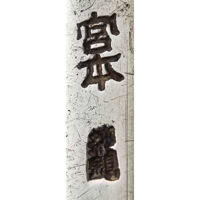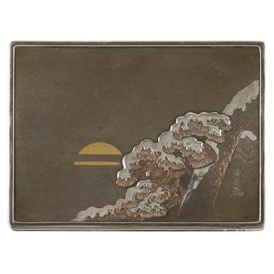 the silver cover inlaid in copper, silver and gold with a snow covered pine tree and the rising sun, signed 'Kiyohiro', the base marked 'Miyamato'