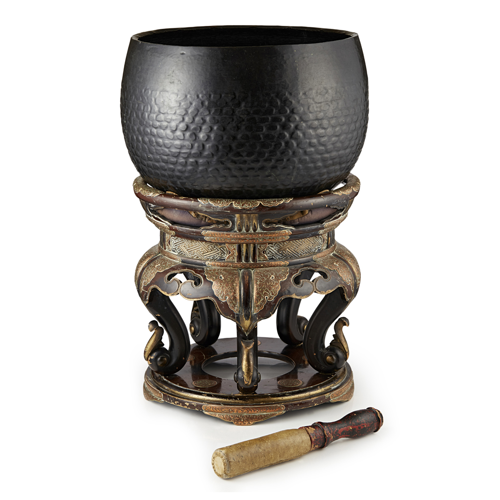 LARGE BRONZE TEMPLE GONG AND STAND, KEISU