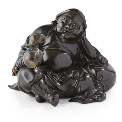 Hotei shown seated and leaning comfortably backward with the right arm supported on his bag of treasure, watching a rat perched atop the hand drum in his right hand, the base with an incised signature