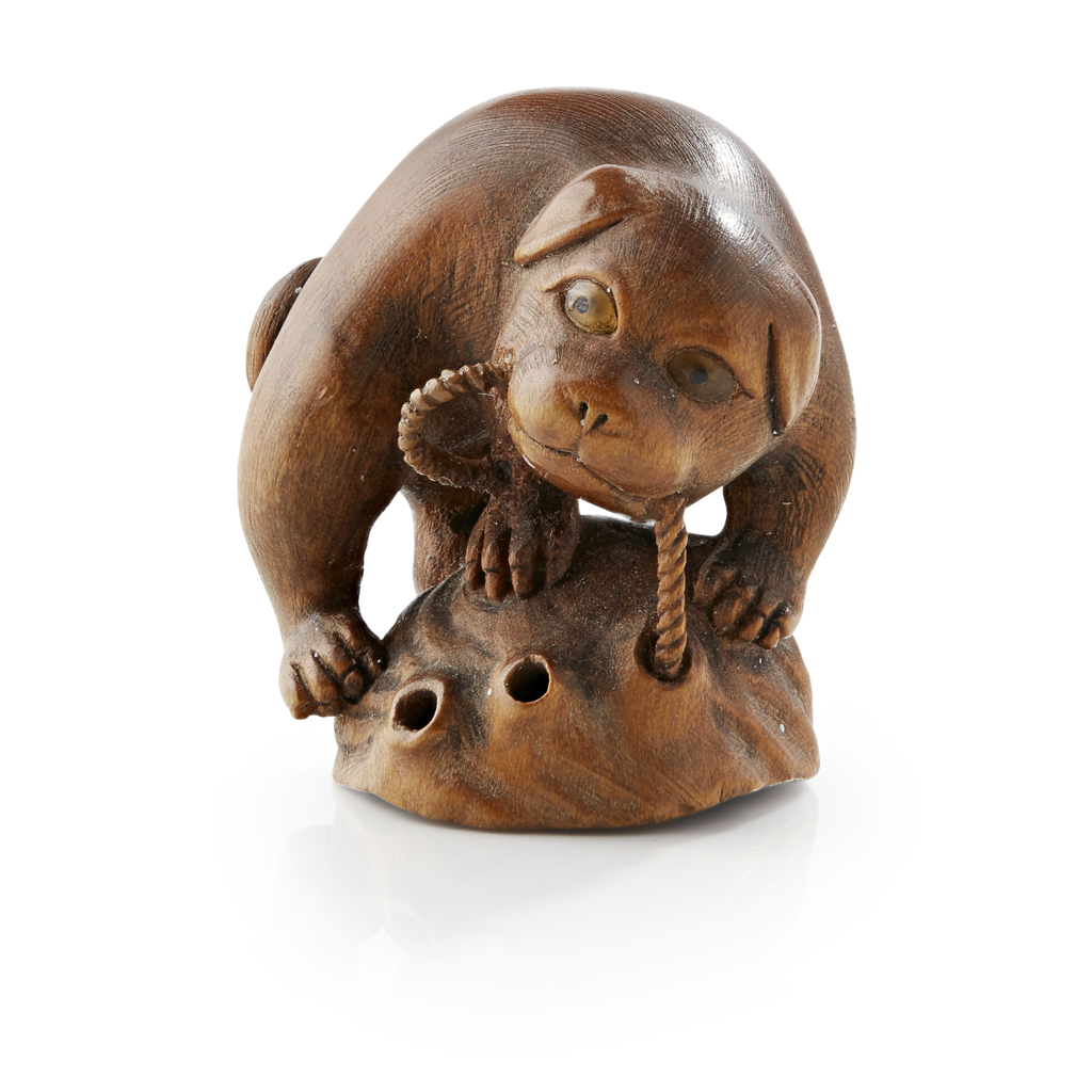 the dog shown standing on a rock with head turned sideward, holding a rope in its mouth, the eyes inlaid with pale translucent horn