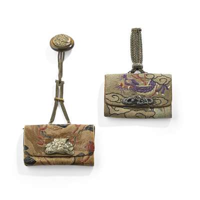 the first of leather, bearing a white metal mae-kanagu (clasp) depicting the Seven Lucky Gods travelling in the takarabune(treasure boat) attached by a multi-strand metal chain to a manju netsuke; the second of crewel, with a dragon-form mae-kanagu (2)