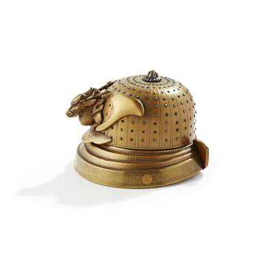 naturalistically modelled as a dome-shaped suji bachi with raised ridges, adorned with a crest in the form of a ferocious dragon, the box raised on a stepped base with floral decoration