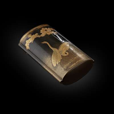 decorated in gold hiromakie on a roiro ground with three cranes under a pine tree
