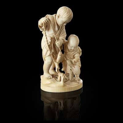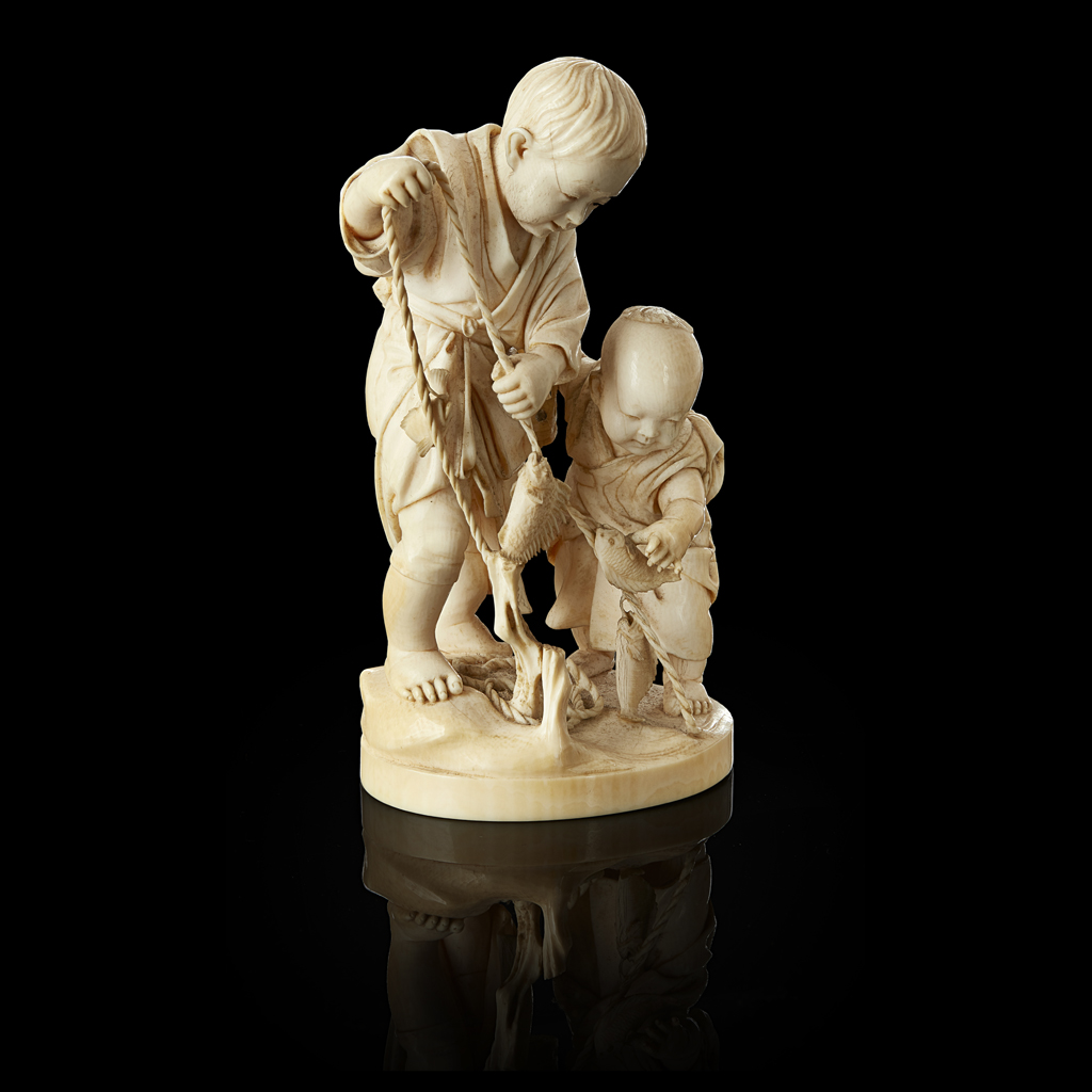 IVORY OKIMONO OF TWO BOYS CATCHING FISH Y