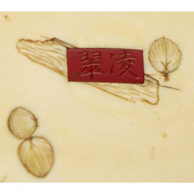 the fisherman shown standing holding a basket filled with his catch, wearing a reed apron over his tunic, signed to the base within a red lacquered reserve