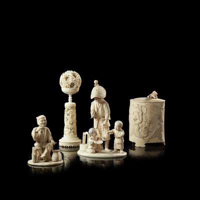 the first depicting a fisherman holding a carp, signed Hisakazu within a red lacquer reserve, 10.2cm high; the second depicting a man smoking a pipe whilst watching two boys play, 18.5cm high; together with an IVORY TUSK BRUSHPOT AND COVER, carved with two elephants fighting two tigers, 14.5cm high; and a CANTON IVORY PUZZLE BALL AND STAND, with a fitted Japanese wood box, 19.5cm high (4)