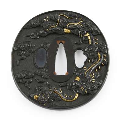 decorated in high relief on a fine nanako-ji ground with a dragon leaping amongst lingzhi clouds, with gilt highlights