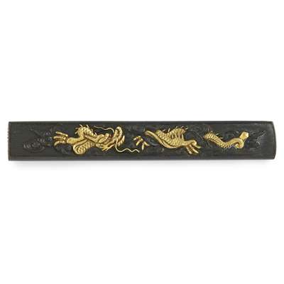 overlaid on a shakudo nanako ground with a dragon striding amongst scrolling clouds, the dragon gilt, unsigned
