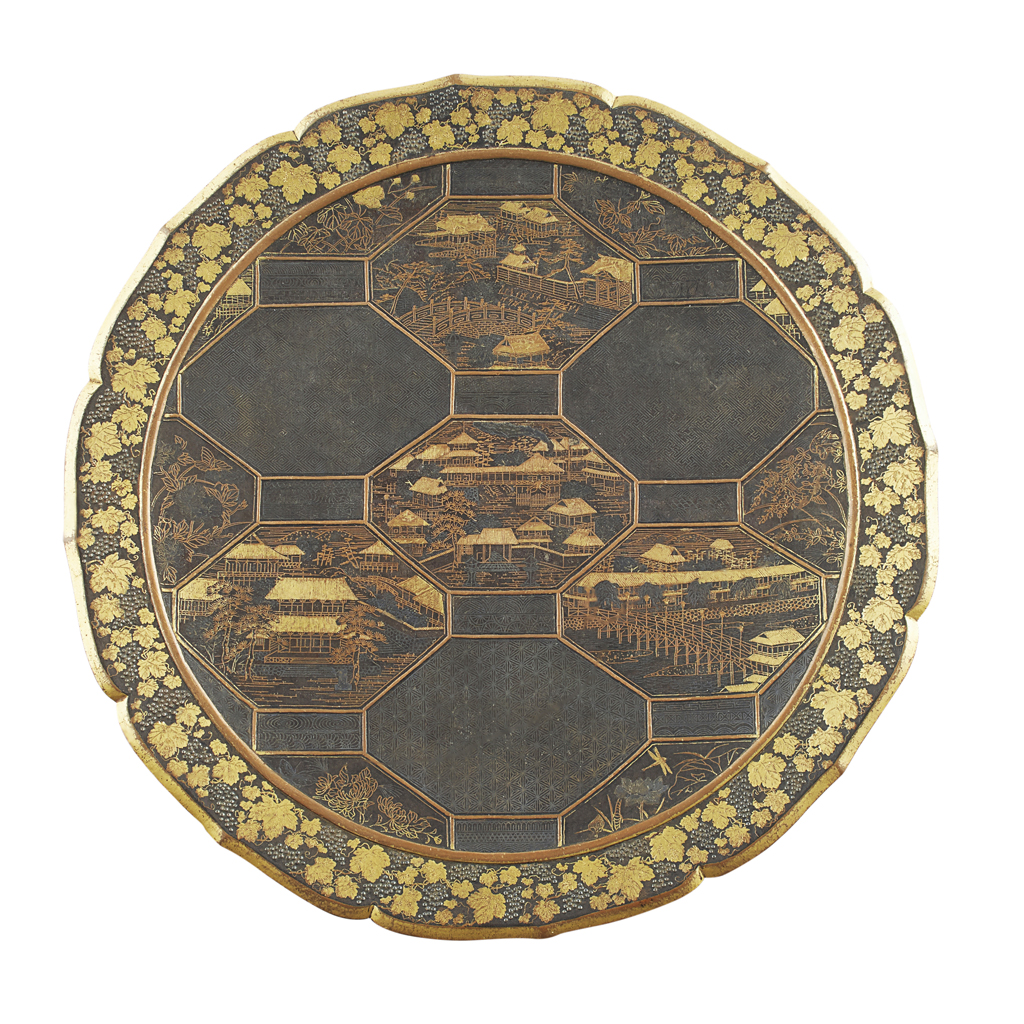 of lobed form, inlaid in gold, silver and copper nunome-zogan with octagonal panels containing traditional Japanese dwellings, the rim with a band of fruiting grape vines