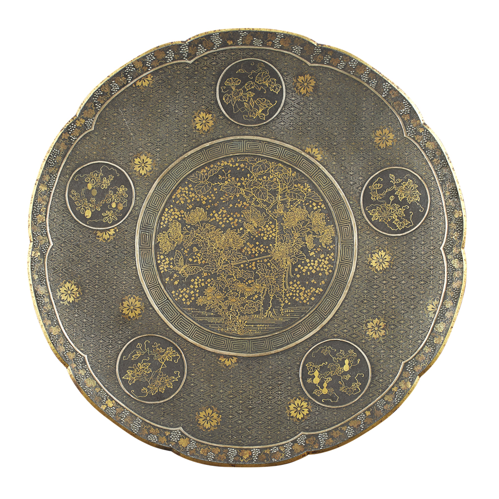 worked throughout in silver and gold nunome-zogan with a central medallion depicting a butterfly amid lush foliage, encircled by five smaller medallions of flowering or fruiting plants on a brocade ground