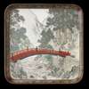 finely enamelled with a red wooden bridge straddling a gorge with rushing water, surrounded by pine trees, the border decorated with flowers on foliate scrolls