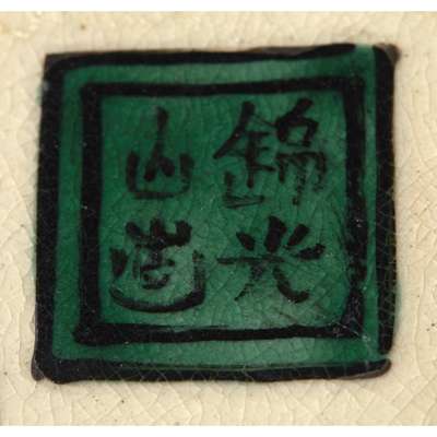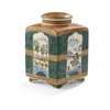 of square section, decorated on each of the four sides with a landscape panel reserved on a green ground with stylised pine motif, the shoulder and the cover with gilt leaves