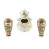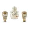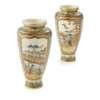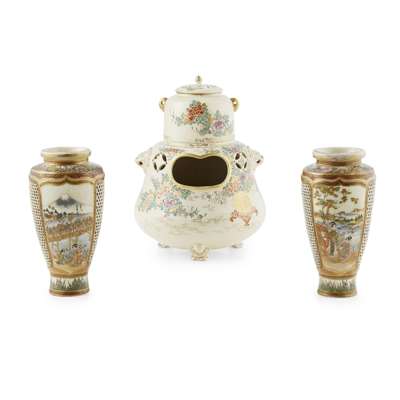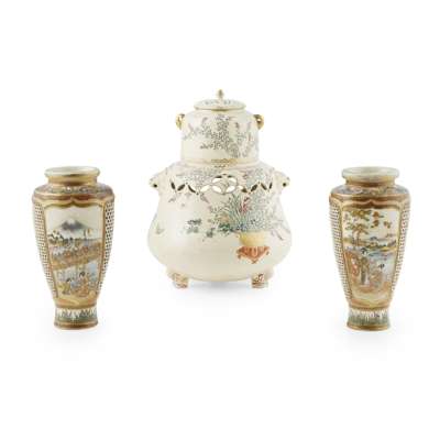 finely painted with a jardinière and a basket containing flowering lilies, chrysanthemums and peonies, butterflies flitting by, the tripod stand with a pair of lion-head handles, 24cm high; together with a pair of RETICULATED SATSUMA VASES, painted with landscape scenes featuring Mount Fuji, 17.5cm high (3)