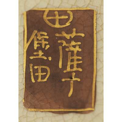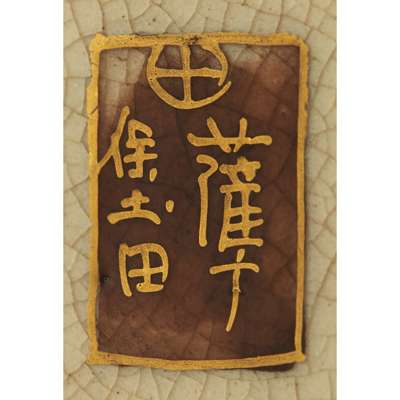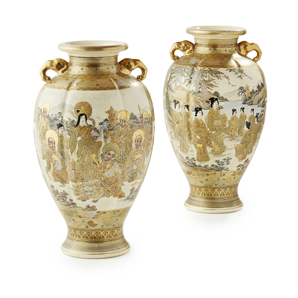 the ovoid body decorated with four panels depicting beauties in a lakeside garden and a gathering of Buddhist rakan and Kannon, reserved on a gilt ground with composite floral and geometrical patterns (2)