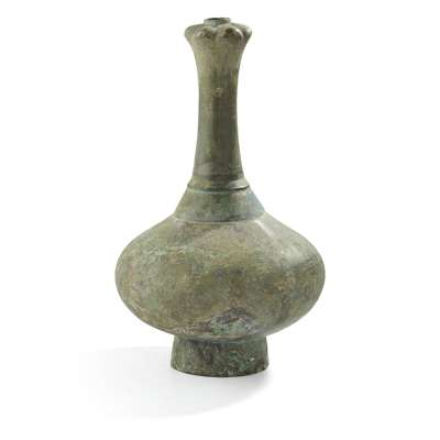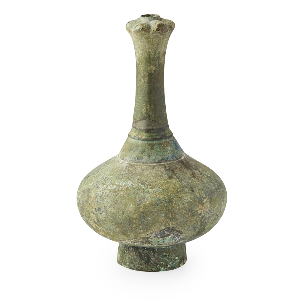 the compressed globular body supported on a splayed foot and rising to a slender waisted neck with a raised bowstring band, the mouth of lobed form, with verdigris patination throughout