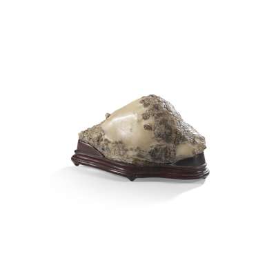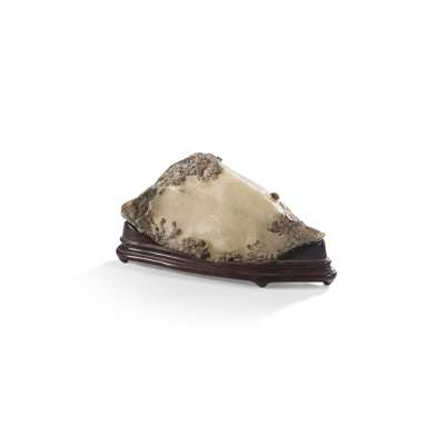 of triangular shape, the white agate with a smooth surface and fine natural grains on one side, partially covered with sedimentary material, supported on a conforming wood stand