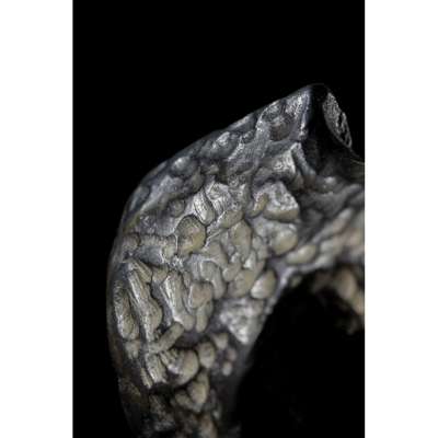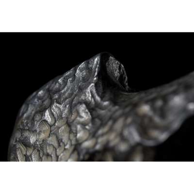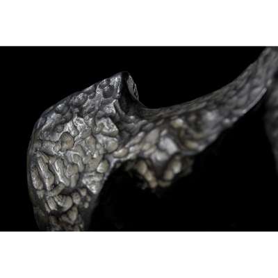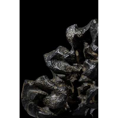 the dark grey stone rising from a horizontal plane to a central peak, with twisted branches sculpted by the natural perforations to the body resonating with mountainous grottoes, the surface with shallow dimples catching and scattering the light pulling your eye to explore further, mounted on a conforming wood stand