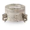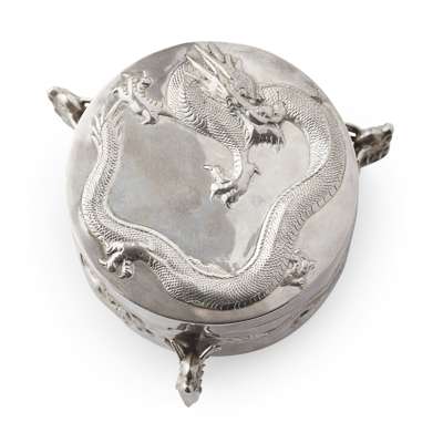of circular shape, repoussé worked on the cover and around the sides with dragons, supported on three cabriole legs in the form of dragons, the base marked W.H. in English and with an illegible Chinese mark