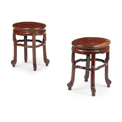 PAIR OF HONGMU STOOLS WITH INSET CLOISONNÉ ENAMEL PANELS