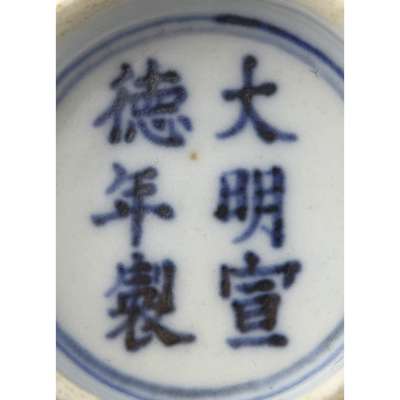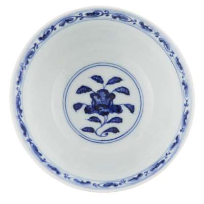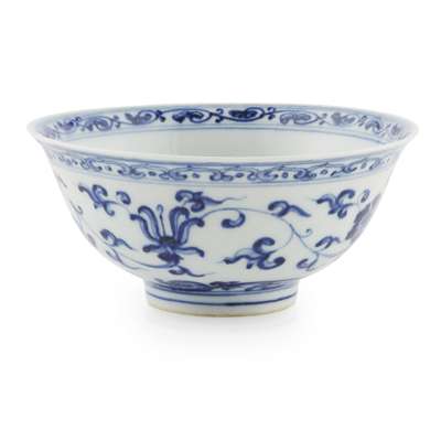 the deep rounded sides rising to slightly flaring rims, the centre of the interior painted with a central medallion and a leafy spray of peony below a border of continuous floral scroll at the rim, the exterior painted with a broad band of four lotus blooms borne on meandering leafy scrolls, the base with a six-character reign mark with double circles