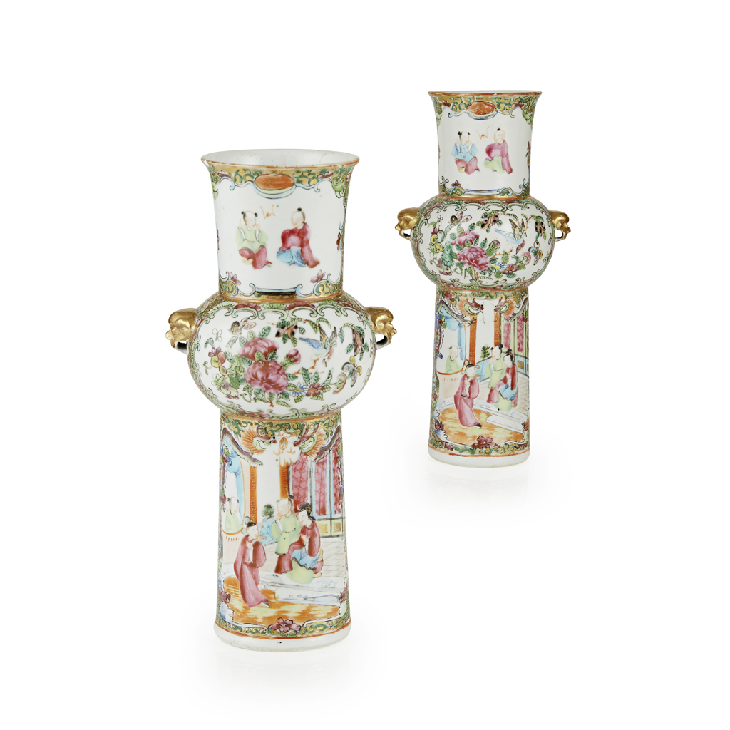 PAIR OF CANTON FAMILLE ROSE BEAKER VASES