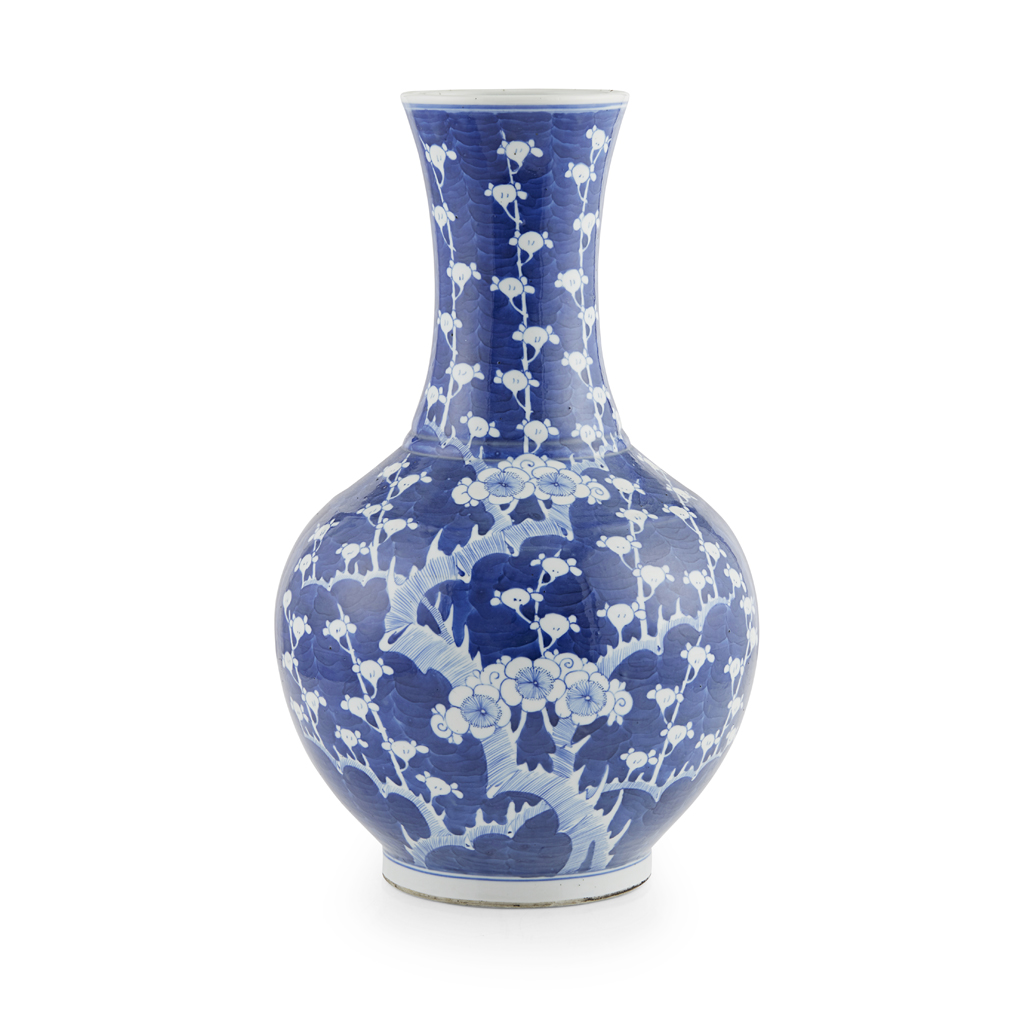 the globular body below a slightly waisted neck, decorated with the typical 'cracked ice and prunus' pattern, the base with a six-character apocryphal Kangxi mark